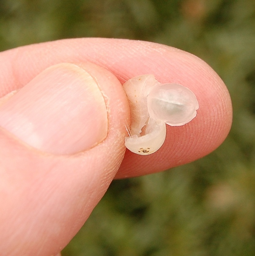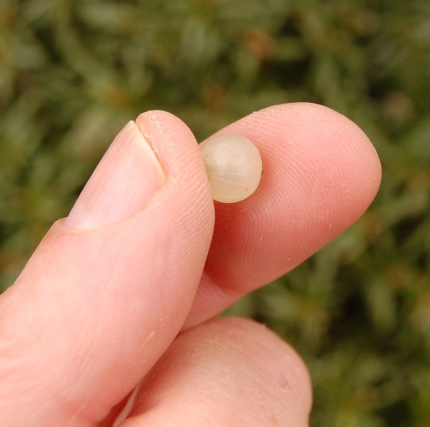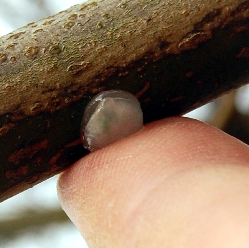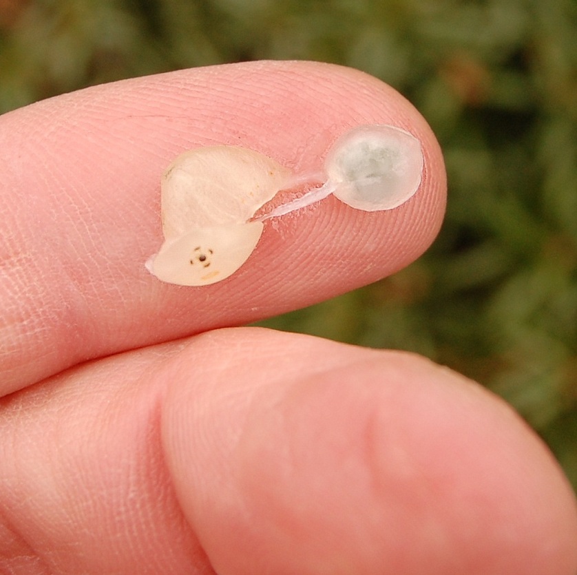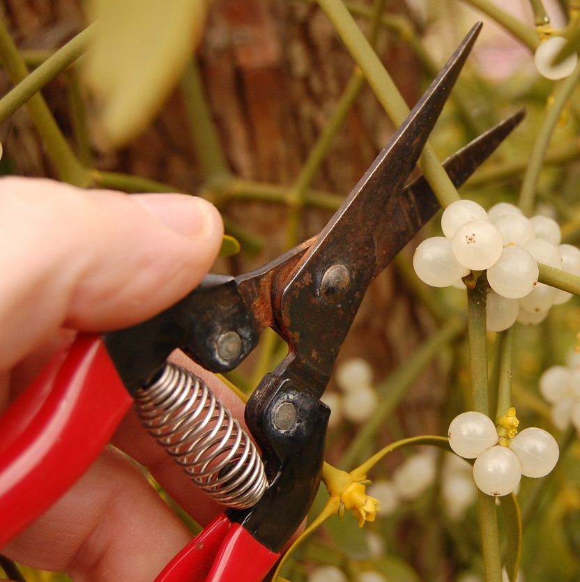 Er kan in principe worden gezaaid vanaf januari tot half april waarbij de voorkeur uitgaat naar half april. Het duurt dan maar kort voordat de duikertjes verschijnen en hun weg zoeken naar de boom. Pluk de bessen zo kort mogelijk voordat je ze gaat zaaien (1) en als je dat nog niet meteen kunt doen bewaar ze dan koel, vochtig en licht. Omdat het kiemplantje al chlorofyl bezit is dit licht heel belangrijk. Neem de bes tussen duim en wijsvinger en knijp erop zodat het zaadje met wat ‘lijm’ uit de bes geperst wordt. (2, 3 en 4)Ik smeer dit aan de onderkant van een horizontale tak(5). Dit is een vies kleverig klusje en het is vaak een kunst om hem aan het