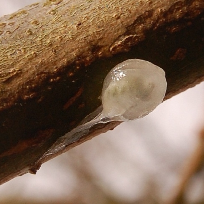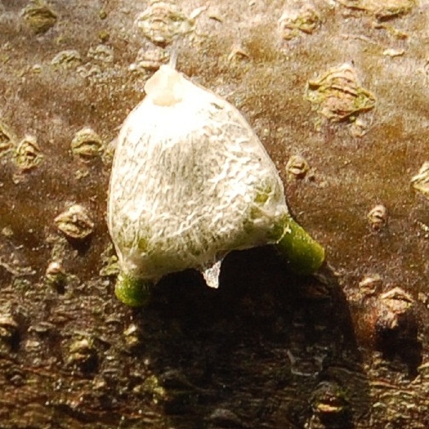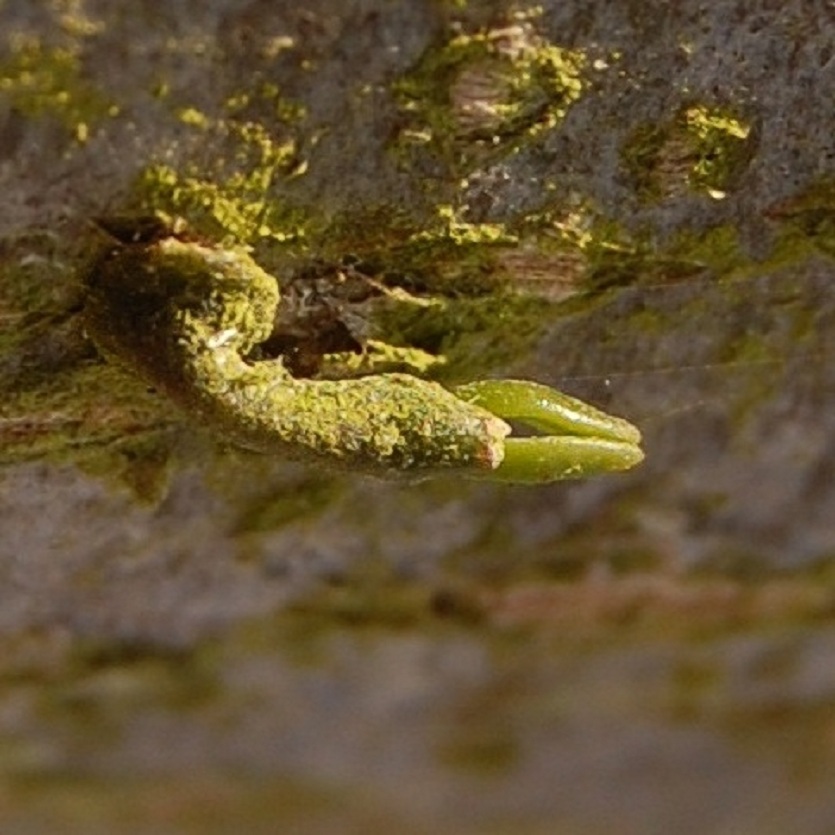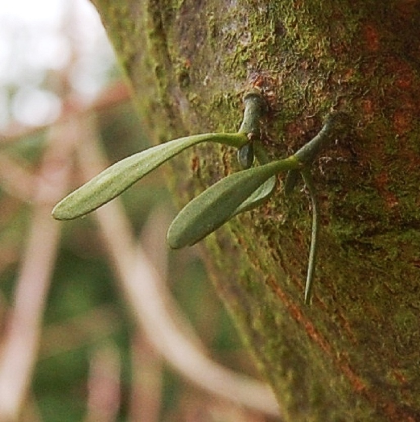 plakken te krijgen. Als hij eenmaal zit droogt de lijm voor een groot deel in en zit het zaadje na enkele dagen helemaal vast op de tak. Na enige tijd verschijnt er een duiker, vaak zelfs twee of drie(7).Omdat het zaadje/plantje het eerste jaar helemaal op zichzelf is aangewezen is het zaak te voorkomen dat het kan verdrogen. Ik hang hiervoor een oud plastic schaaltje onder de zaadjes, zo kort mogelijk eronder, hetgeen ik vul en gevuld hou met water. Bovendien worden de zaadjes het eerste jaar elke dag dat het niet regent gesproeid met regenwater. Pas als tegen het einde van de zomer de duiker het spinthout heeft bereikt en het plantje los komt van de boom (8) kan hij leven van zijn gastheer. Het schaaltje kan worden verwijderd en ook sproeien hoeft niet meer. Als alles volgens het boekje gaat verschijnen in het erop volgende voorjaar de eerste twee blaadjes(9 en 10).Dat het ook anders kan lees je bij ‘Eigen ervaringen’.